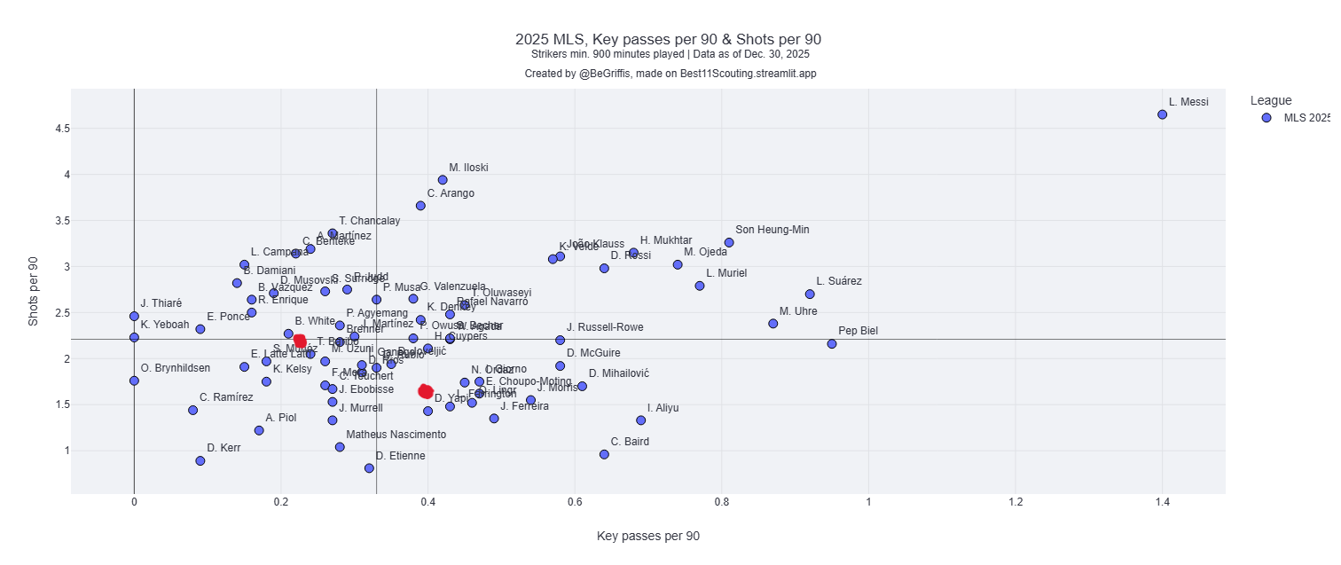 Madrigal is a very efficient player. He’s able to score and assist on minimal touches in the box. In 2025, MLS forwards averaged .11 non-penalty expected goal contributions (xG+xA) per touch in the box. Nashville’s DP funnel was elite at getting the ball to their top players. Hany Mukhtar and Surridge averaged .13 NPxG+xAG per touch in the box, while the rest of the Boys in Gold sat around .09. In 2025, Madrigal averaged .14 NPxG+xAG per touch in the box and .12 in 2024. When he gets the ball, it’s usually in a good spot.