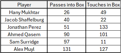 The below above clearly shows the roles on the team for the NSC attackers. It displays their league rank among attackers for passes into the box and touches in the box, both per 90 minutes.