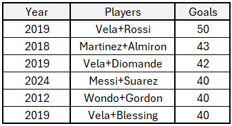 Surridge and Mukhtar ripped Orlando to shreds on Saturday, combining for four goals and bringing their total to to 34 goals with six games remaining in the 2025 season. The all-time leaderboard for goals by a duo is built on LAFC legend Carlos Vela’s record-breaking season in 2019, with Vela plus a teammate making up three out of the top six. Vela combined for 50 goals with Diego Rossi in 2019, sitting at the top if the list with 50 combined goals. Surridge and Mukhtar only need six more goals to climb into a current three-way tie for 4th place.