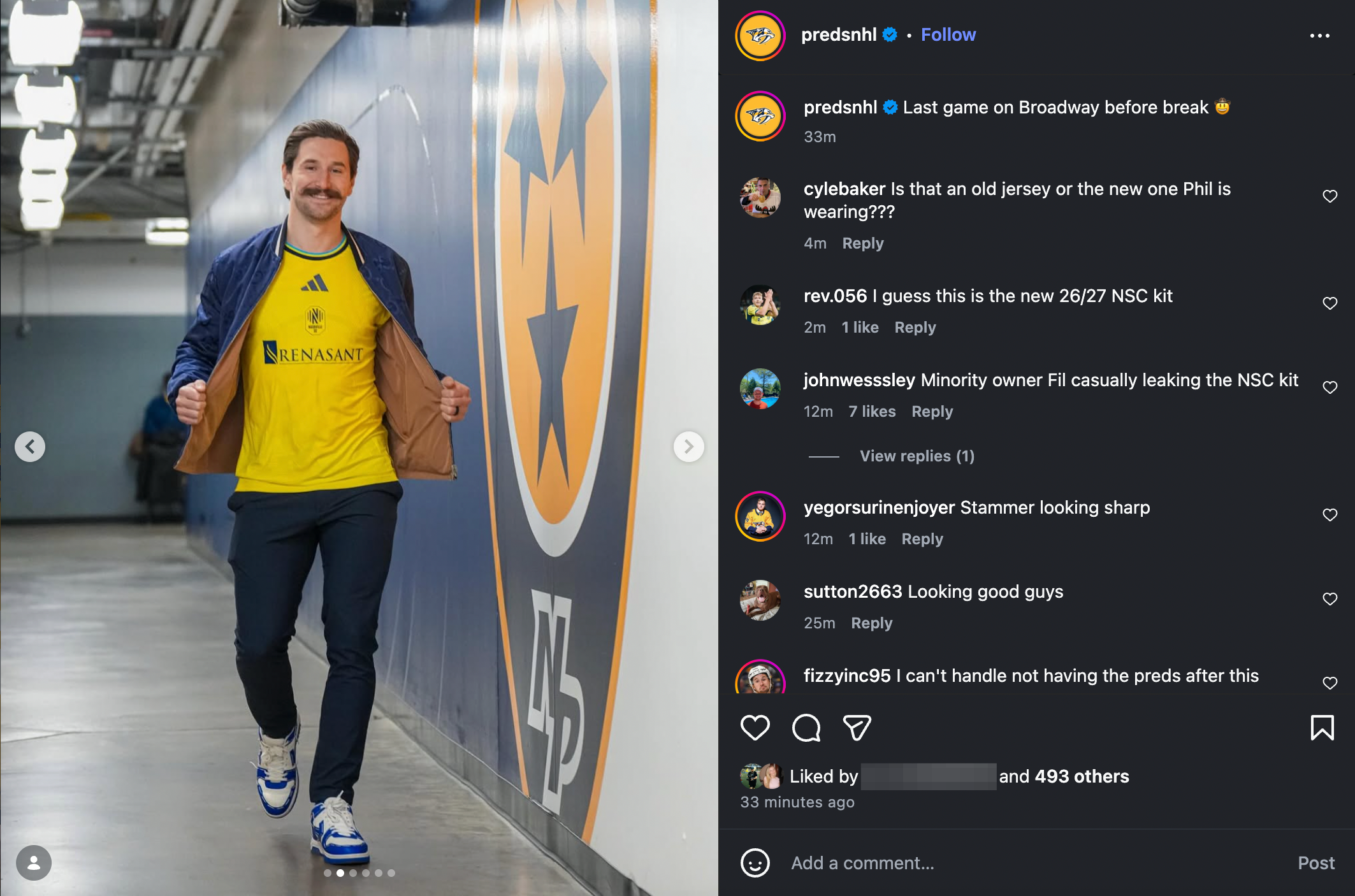 The two-time NHL All-Star, who became a minority owner of Nashville SC in 2023, sported the unreleased shirt to the Predators home match against the Minnesota Wild at Nashville's Bridgestone Arena.