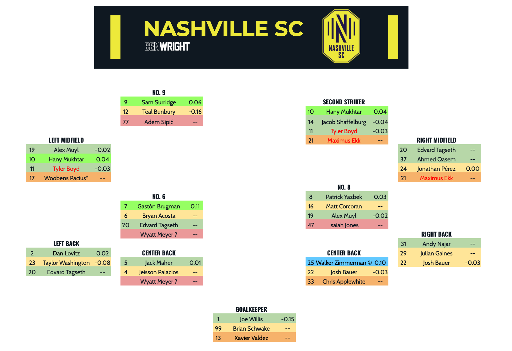 - Gastón Brugman: The 2024 MLS Cup MVP was acquired in a swap deal for Sean Davis, bringing Nashville much-needed ball progression from a deeper area of midfield. BJ Callaghan has referred to him as "the quarterback". He'll be a crucial piece of the puzzle if he can stay healthy.