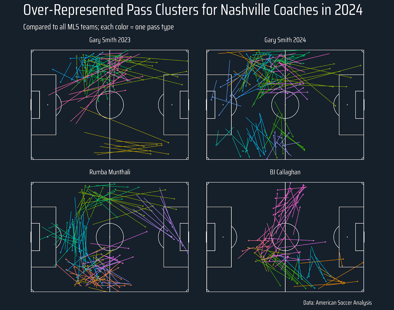 Looking at the types of passes that Nashville made more often than other MLS teams shows Smith’s teams’ penchant for long balls down the wings. This was mostly maintained by Rumba Munthali in addition to a lot of passing around the defensive half. In a limited sample size, Callaghan’s players were more likely to play more passes around the midfield. Callaghan also had Nashville pressing more in their attacking half, as their Per100 against (a proxy for high pressing that compares actual - expected passing per 100 passes) went from -0.8 to -1.38, indicating a more robust high press.