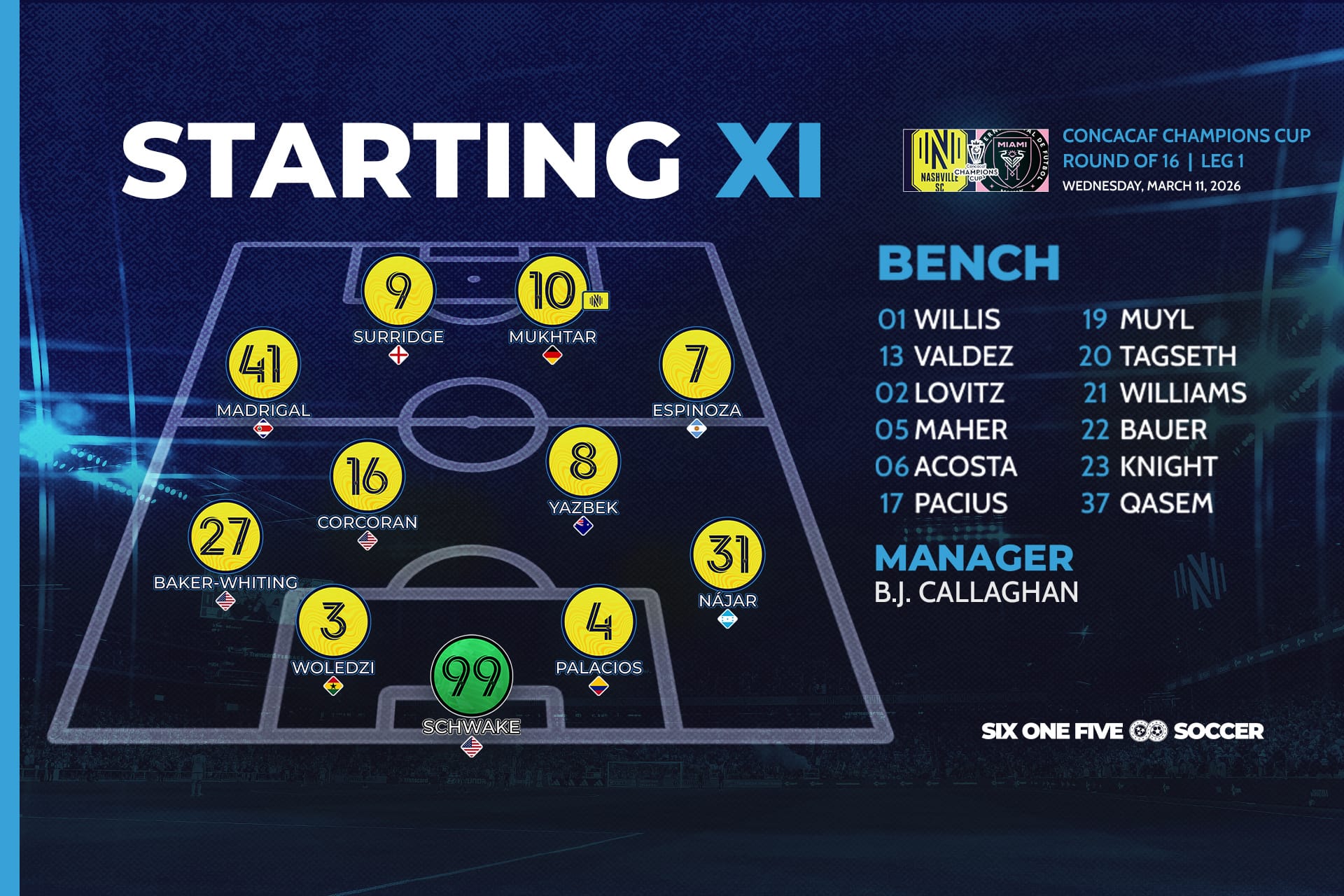 - Big picture: Nashville have all to play for in the second leg. Keeping Miami without an away goal at Geodis gives them a boost, but shutting down this attack again away from home is a big ask.