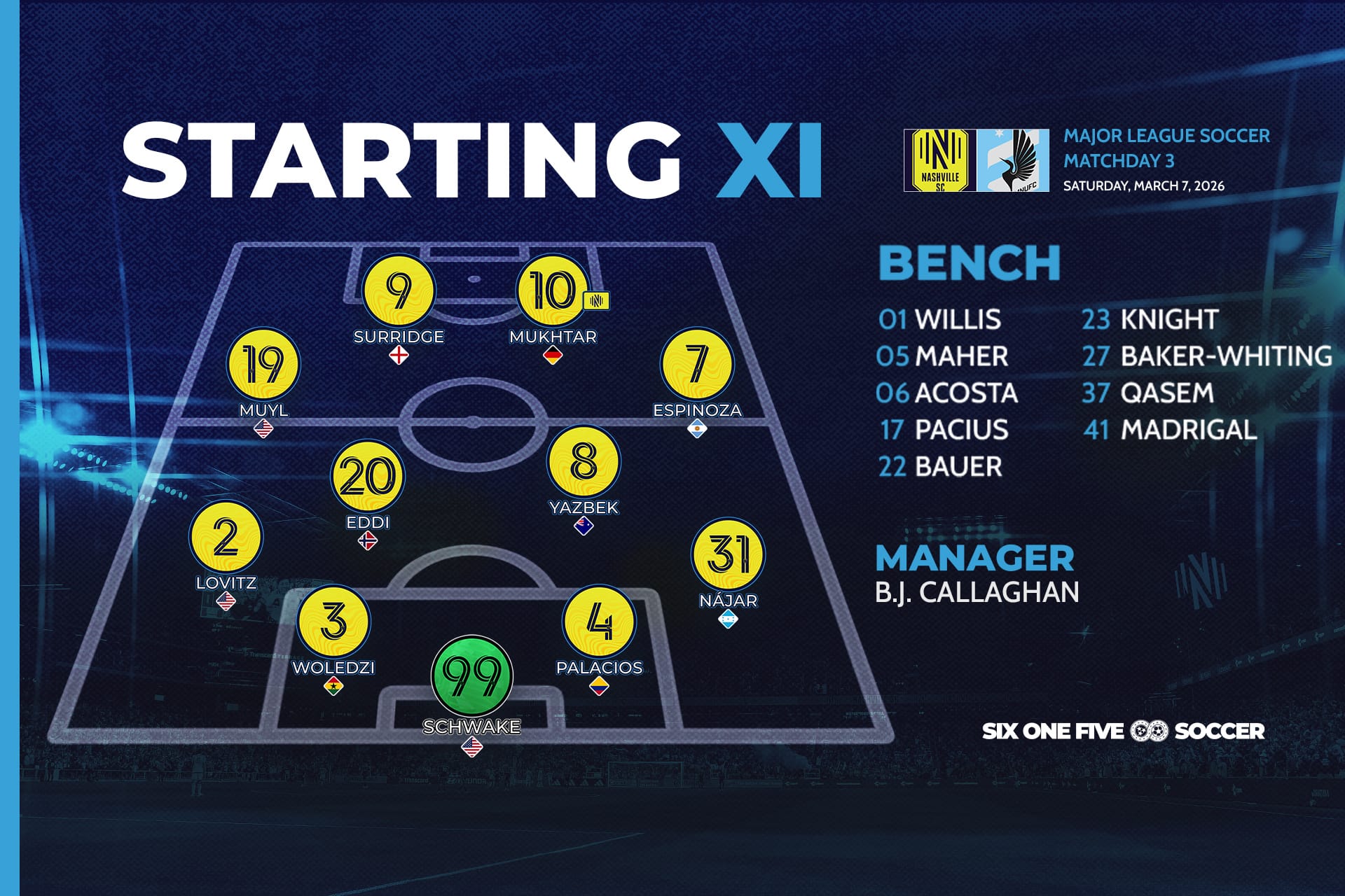 - Patrick Yazbek has been a revelation for Nashville early in 2026, and he continued his form against Minnesota. The young Australian was everywhere and added some real quality with the ball at his feet.